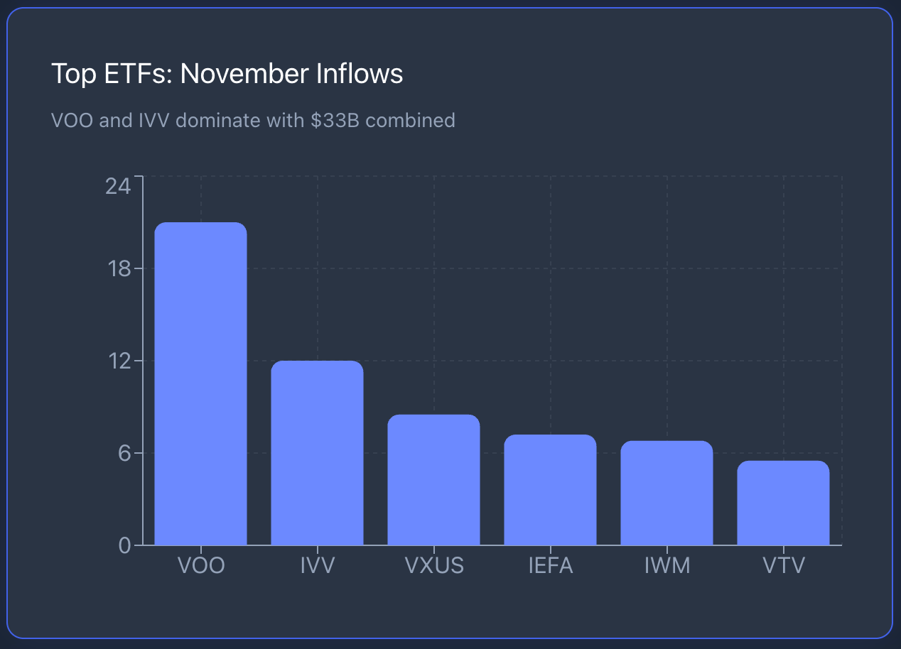 November alone brought in $143.7 billion. Equity ETFs grabbed $71.2 billion of that. Fixed income took $27.5 billion.