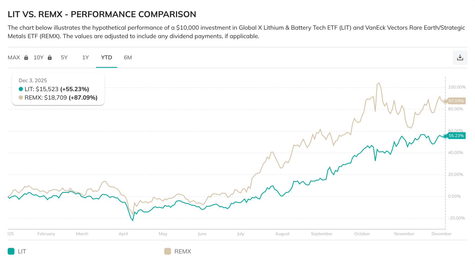 REMX spreads across rare earth producers with lithium exposure. The divergence in performance tells you the market hasn't fully priced in what a domestic supply surge means.