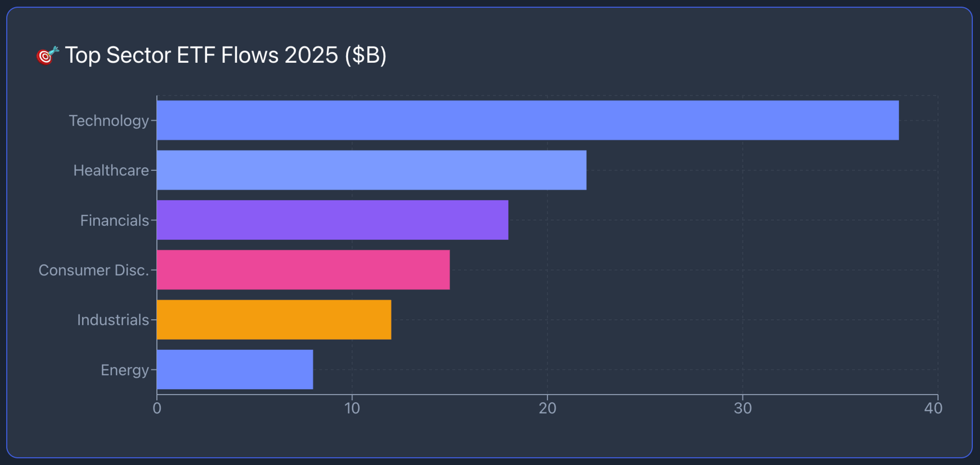 Tech sector ETFs led flows with $38 billion, maintaining positive inflows in 10 of 11 months.