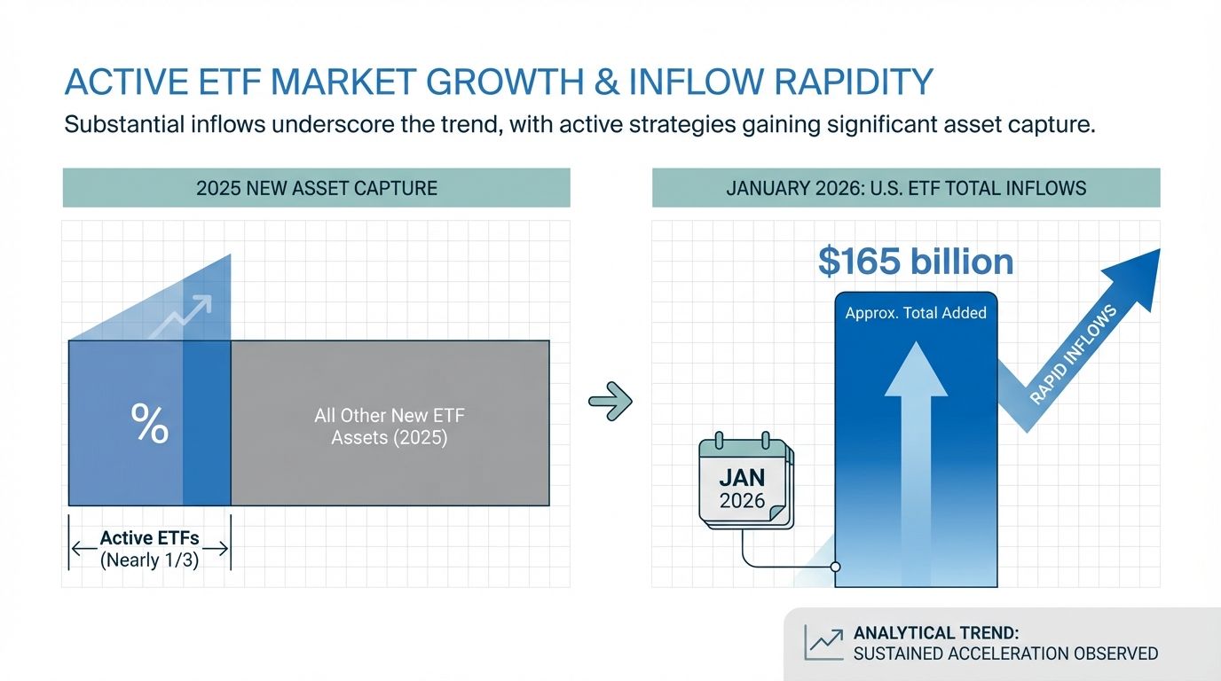 The rapid growth of active ETFs is underscored by the substantial inflows observed in the market. According to the latest data, active ETFs captured nearly one-third of all new ETF assets in 2025, with January 2026 seeing investors add roughly $165 billion to U.S.-listed ETFs. This represents a clear indication that investors are increasingly gravitating towards active management, driven by the desire to capitalize on market opportunities that passive strategies may overlook.