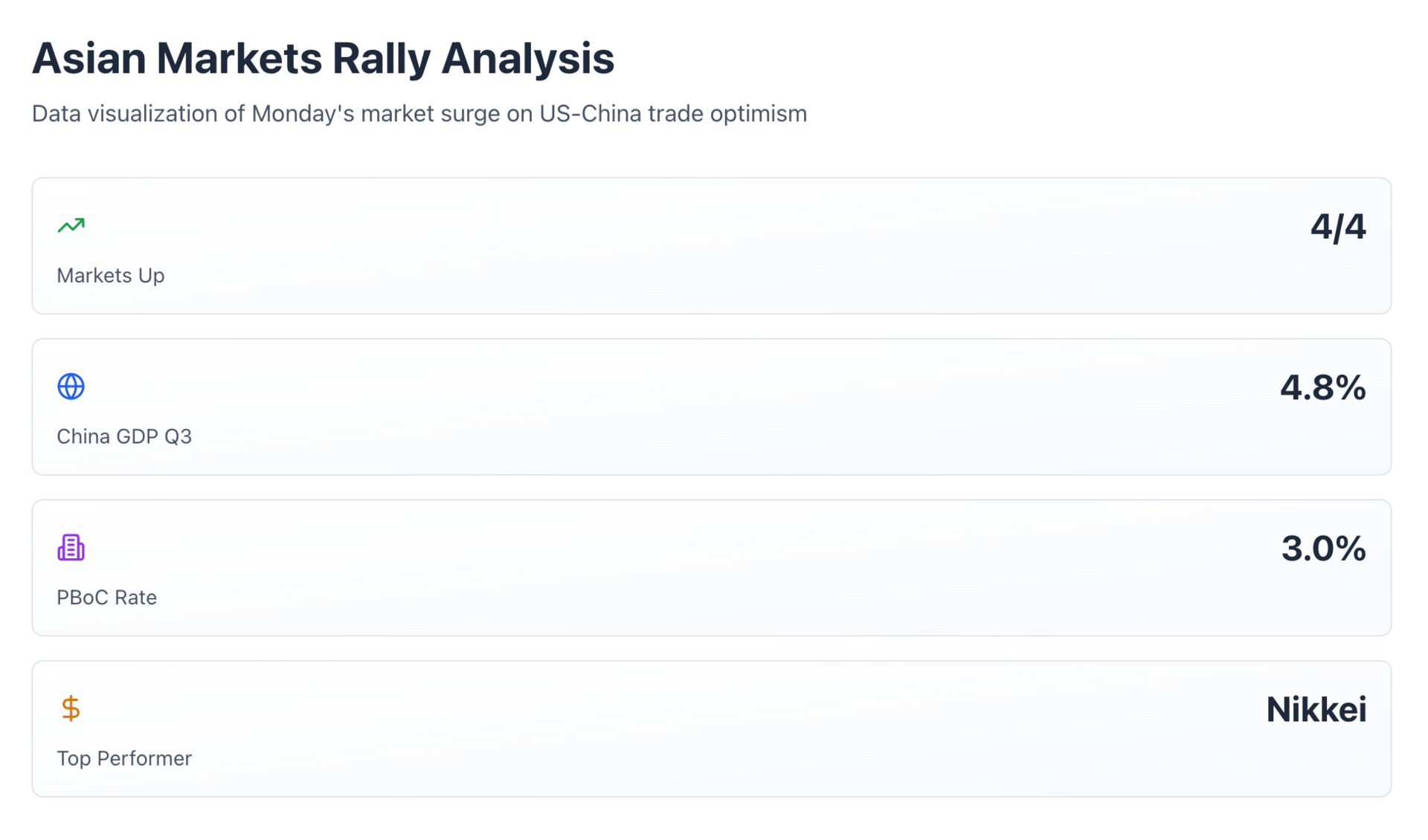 Hong Kong's 2.1% gain reflects direct exposure to US-China relations, while Japan's 3% rally combines trade optimism with domestic political stability.