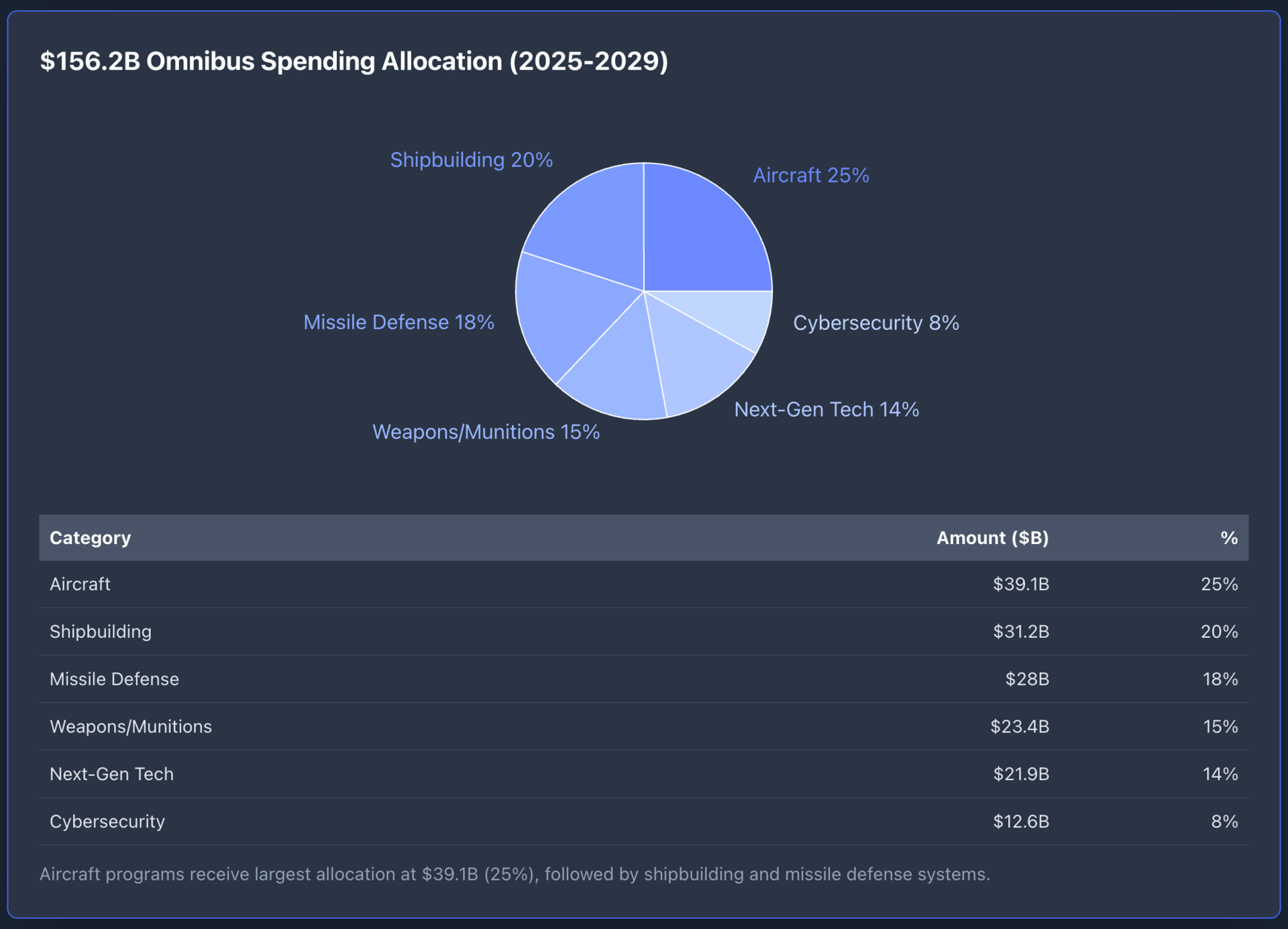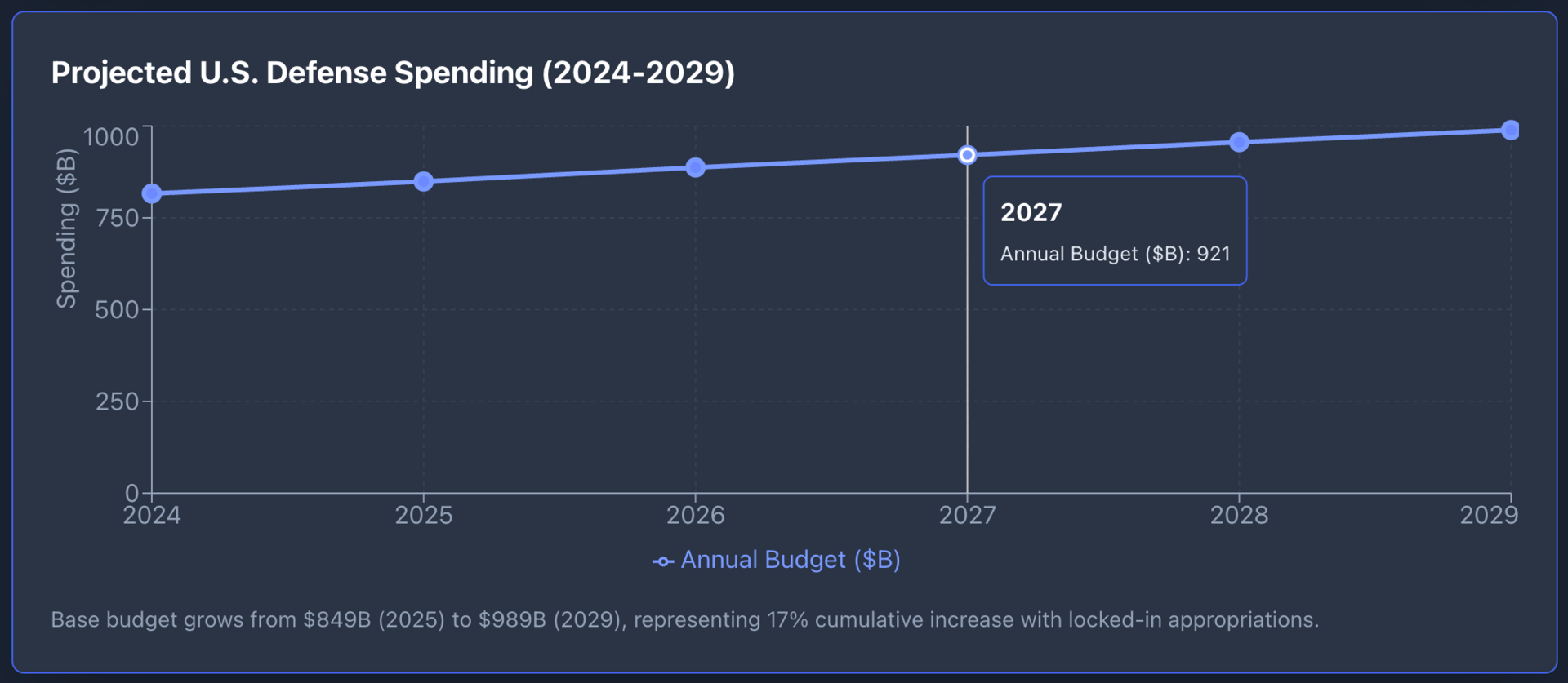 Defense spending hit $849 billion in 2025. Add the $156.2 billion Omnibus package through 2029, and you're looking at over $1 trillion committed to U.S. defense infrastructure.