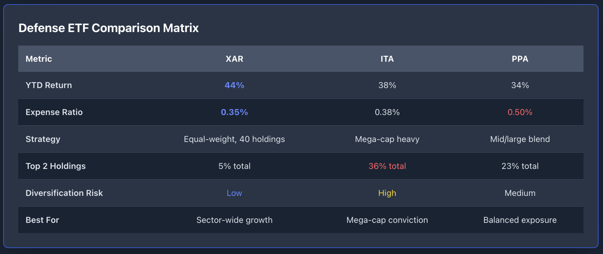 Here's what we know: $XAR returned 44% YTD, $ITA posted 38%, and $PPA delivered 34%.
