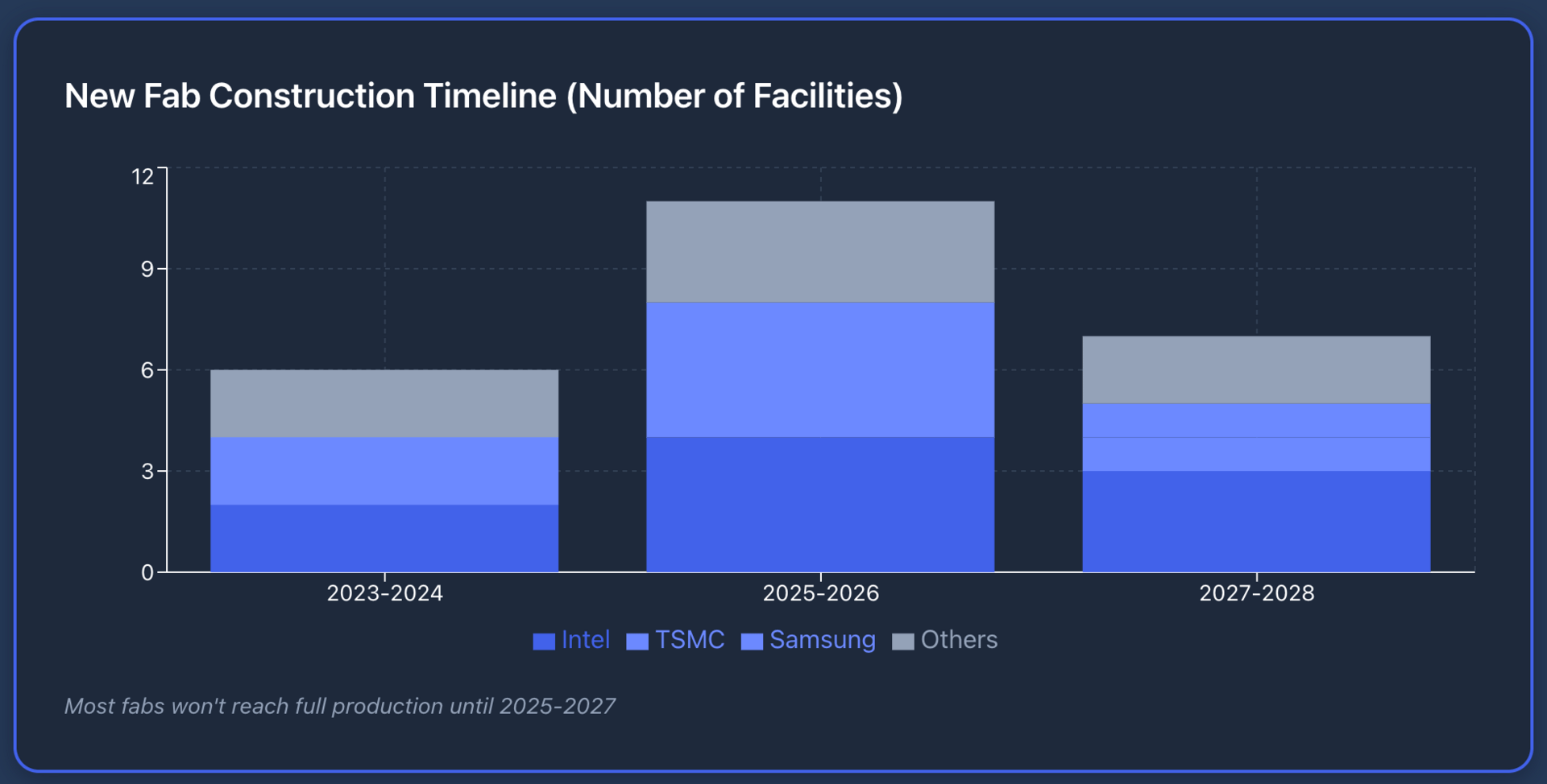 First, capacity is coming online slowly. Most of these new fabs won't reach full production until 2025-2027.