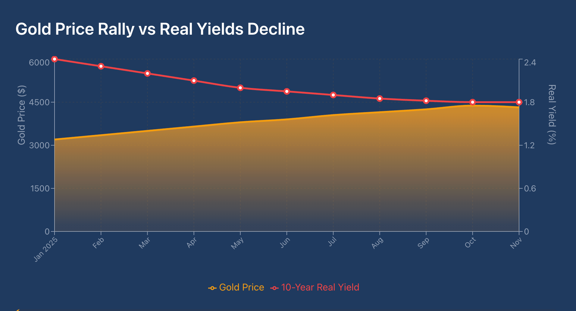 When real yields fall, gold becomes more attractive since it pays no dividend but preserves purchasing power.