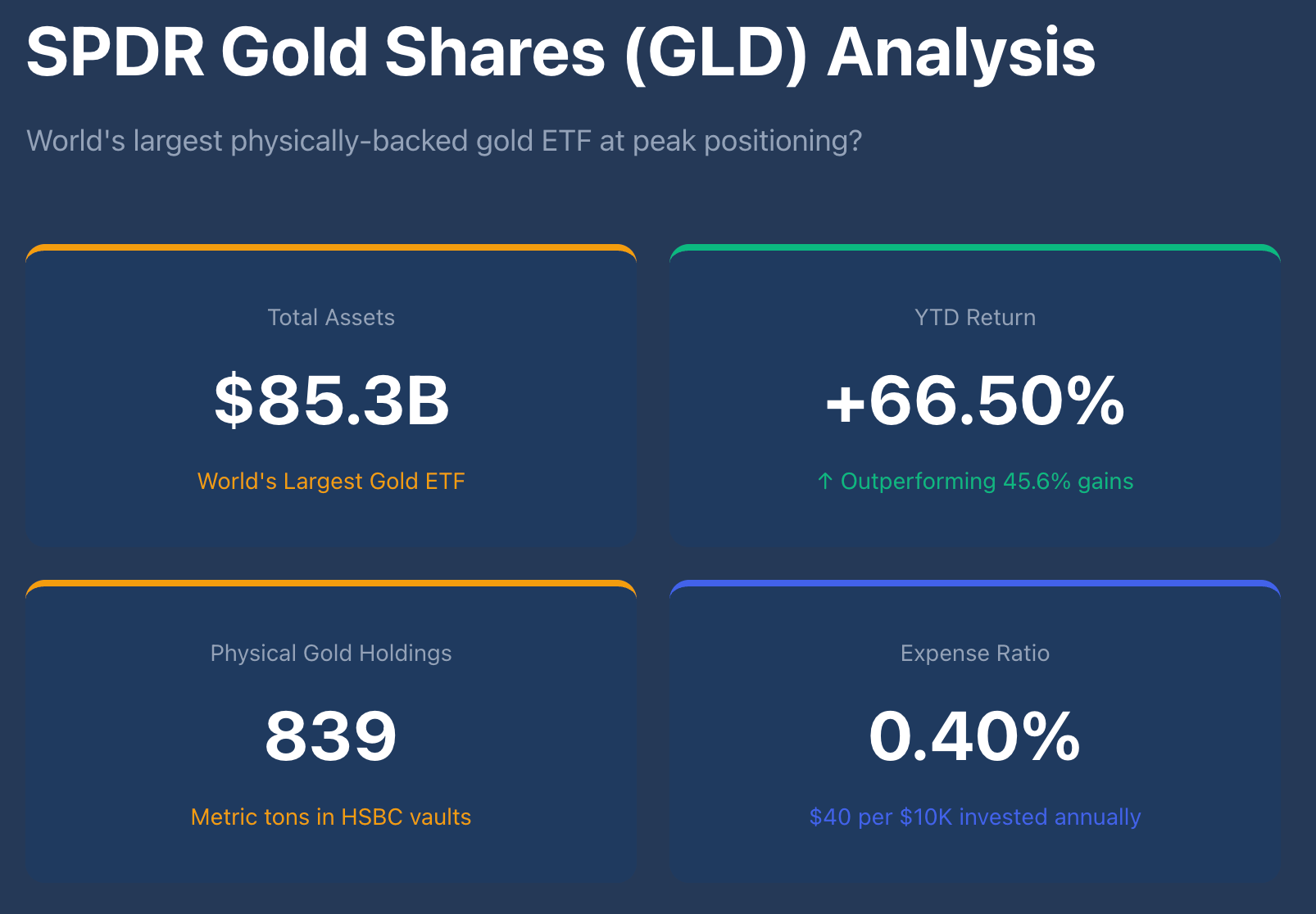 State Street Global Advisors manages the fund with $85.3 billion in custody, backed by 839 metric tons of gold.