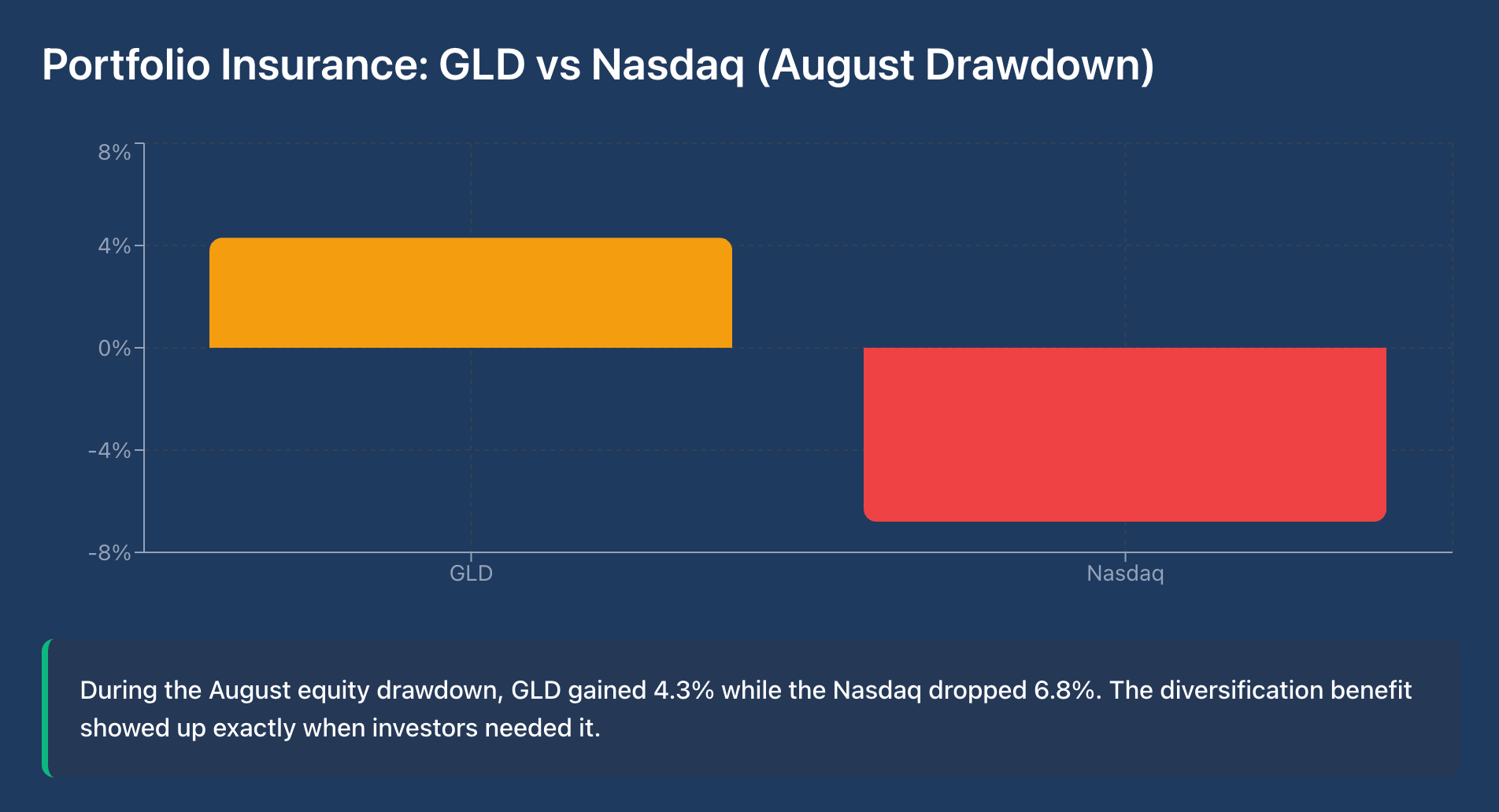 During the August equity drawdown, $GLD gained 4.3% while the Nasdaq dropped 6.8%
