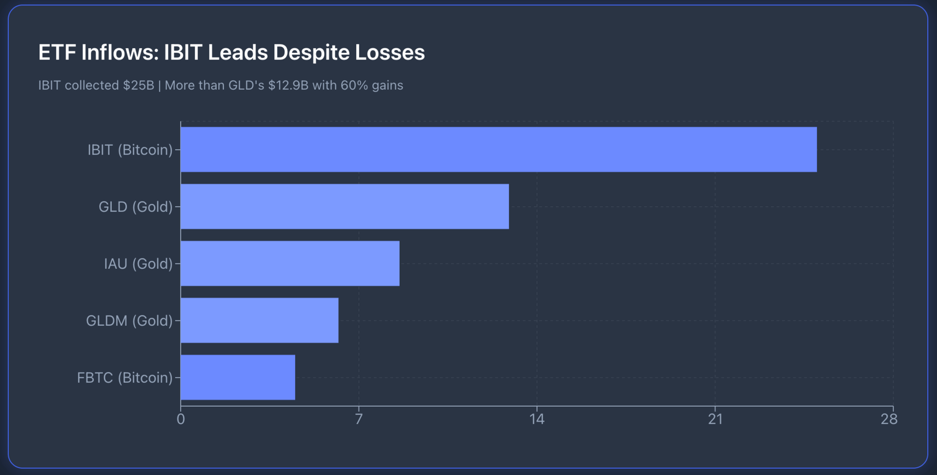 But the full story is more complex. Bitcoin ETFs attracted massive capital despite falling prices. IBIT collected $25 billion, more than GLD with its 60% gain. ETF holders didn't sell during the 36% correction. AUM fell only 3.6%.