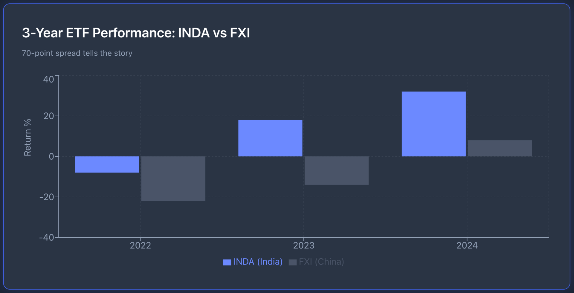 $INDA ( ▼ 1.02% ) returned 42% over the past three years. $FXI, the iShares China Large-Cap ETF, lost 28% over the same period. That's a 70% spread.