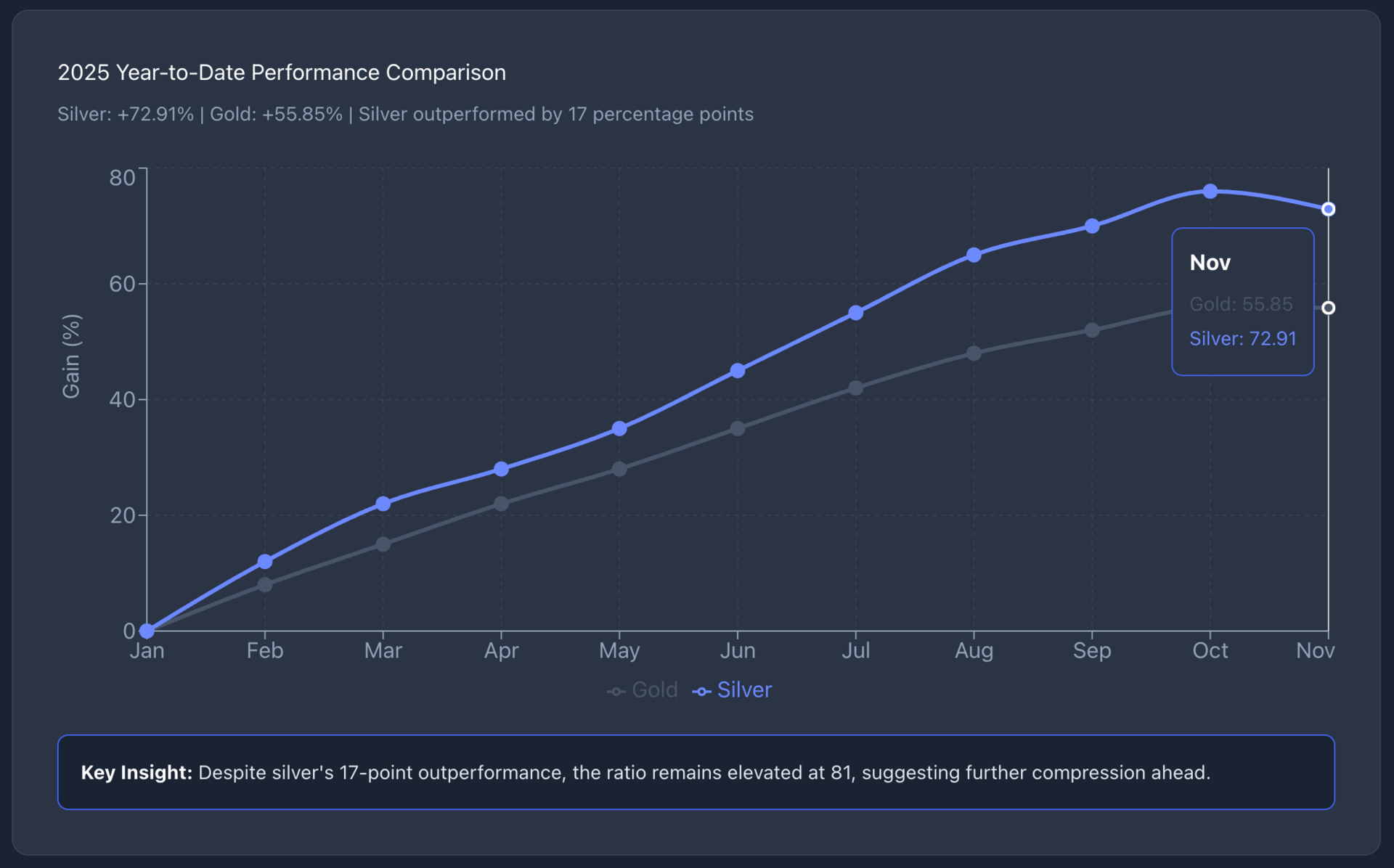 Silver's 76% gain YTD demonstrates the metal's explosive potential when momentum builds. Based on past behavior and historical lows, a further drop in the ratio toward the 60-65 range appears likely. That would require silver to significantly outperform gold from current levels.