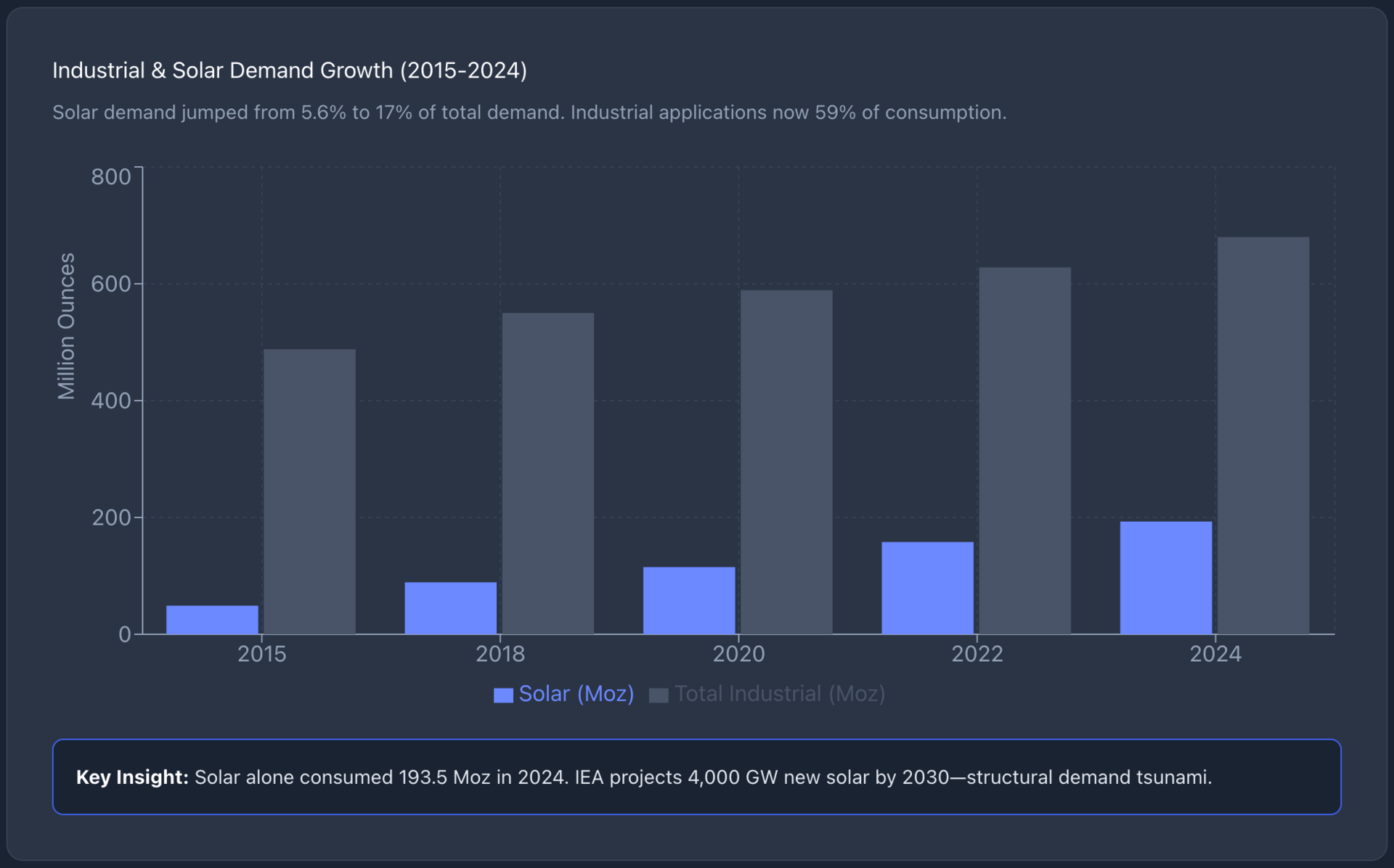 Solar panel manufacturing consumed 193.5 million ounces in 2024, and solar-specific demand now accounts for 17% of total silver demand, compared to just 5.6% in 2015.