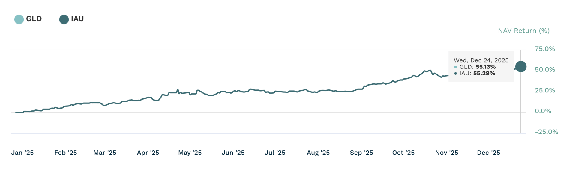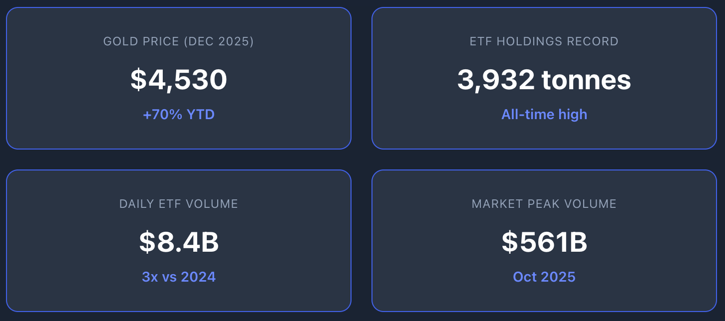 Trading activity confirms the shift in investor behavior. Gold ETF volumes tripled to $8.4 billion daily in November 2025 vs the 2024 average of $2.9 billion.