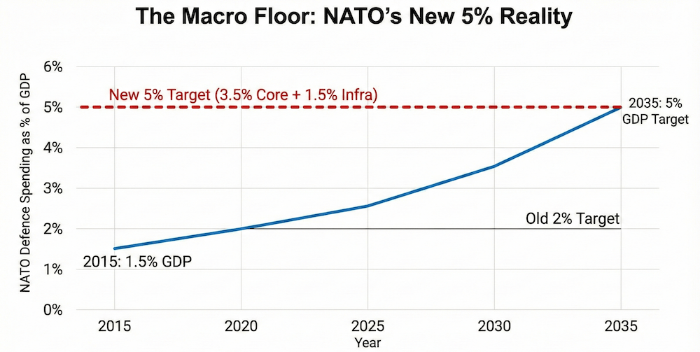 At the recent NATO Summit in The Hague, the alliance effectively abandoned the old 2% GDP target. The new structural commitment is 5% of GDP (3.5% core + 1.5% infrastructure).